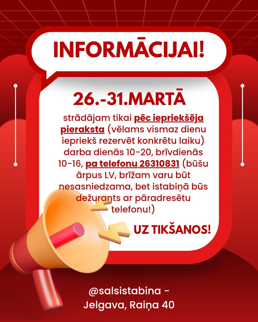 - Sāls istabiņā (Jelgavā, Raiņa ielā 40) pl 10-19 (norēķini skaidrā naudā)
